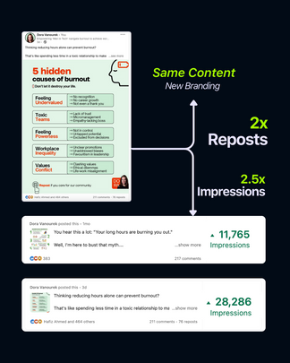 It’s only been 3 weeks, and I’ve already seen 2.5x more reach, 2x more reposts. I’ve had so many people reach out to me in my DM’s, and talk about my branding felt surreal.