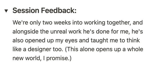 We’re only two weeks into working together, and alongside the unreal work he’s done for me, he’s also opened up my eyes and taught me to think differently. (This alone opens up a whole new world, I promise.) It’s an absolute pleasure working with him, I couldn't’ be happier with everything so far! Can’t recommend enough.”